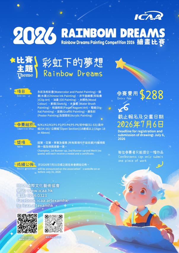 #RainbowDreams2026 #彩虹夢境 #快樂時光 #香港繪畫比賽 #兒童畫畫 #水彩畫 #和諧粉彩 #電繪比賽 #藝術創作 #七彩夢想