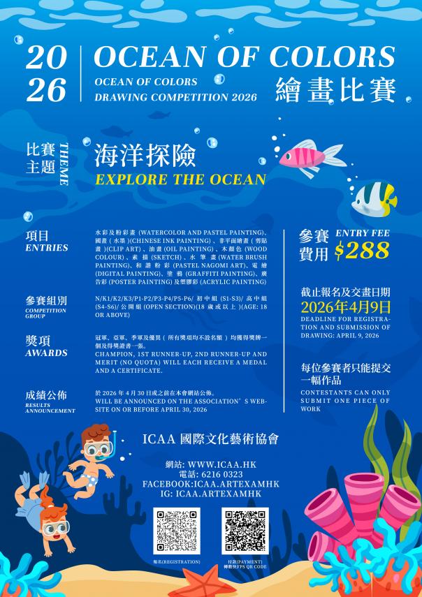 歡迎參加由國際文化藝術協會(ICAA)主辦的Ocean of Colors繪畫比賽2026。本次比賽旨在鼓勵幼兒及青少年展示他們的繪畫才華,同時為公眾提供欣賞藝術的機會。